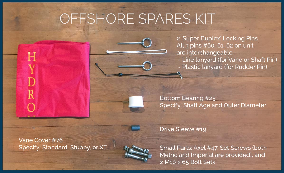 As I’ve told other boaters, don’t leave a harbor without a Hydrovane. Thanks for making a great piece of equipment. In the 40,000 miles we’ve covered, the only repair we’ve had to do was replace the pin that holds the rudder onto the steering shafts and it sheared off in 35 knot winds off the stern starboard quarter a long time ago.
