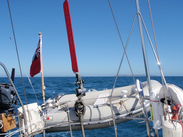 …it shows the Hydrovane in use with our dinghy to show that you can actually use the Hydrovane with a dinghy stowed in the davits – not a very windy day though! This set up works really well like this and the dinghy does not interfere with the Hydrovane – in fact the Hydrovane helps to keep the dinghy solid and stop it moving around.