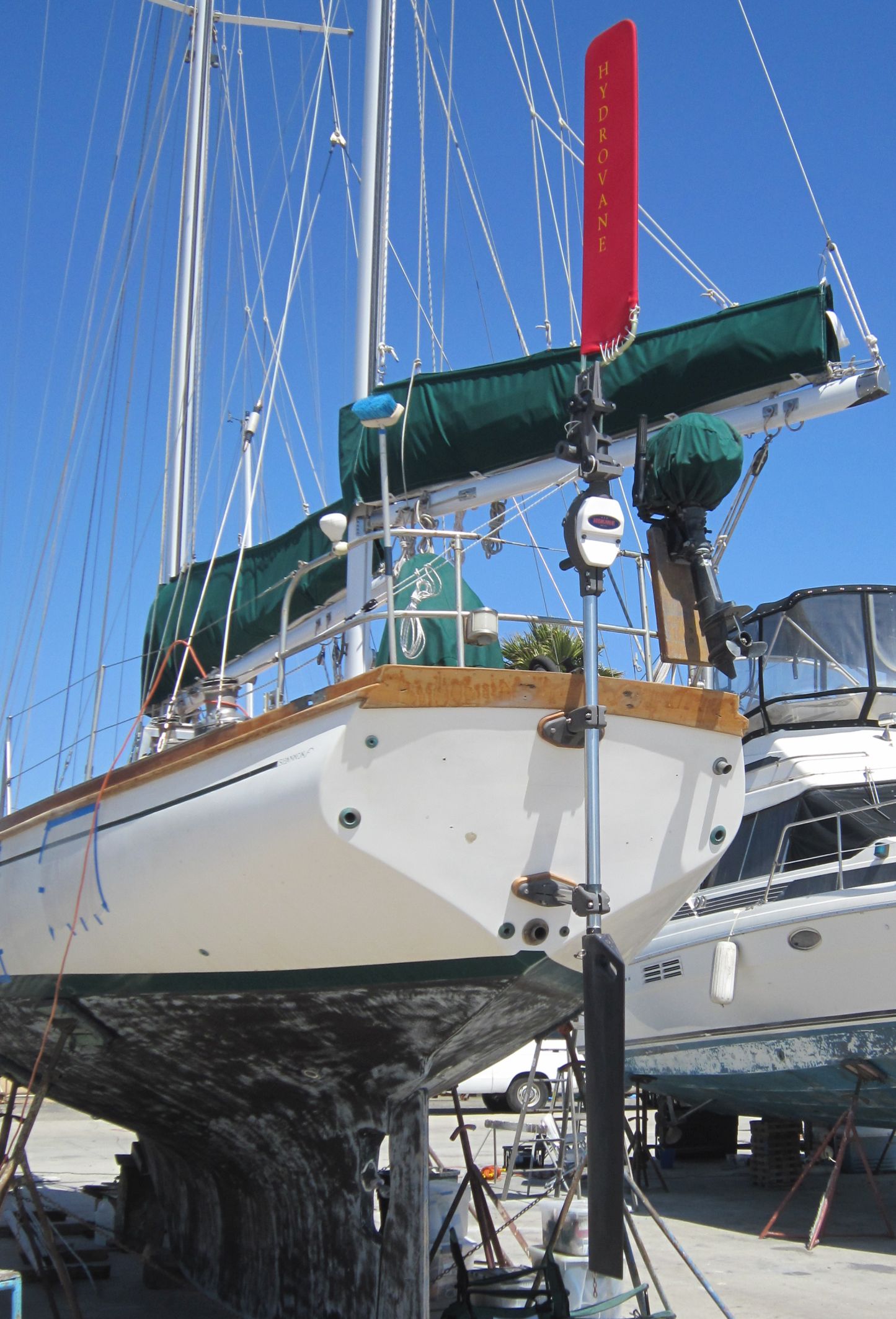 Most choose to install the Hydrovane rudder for passages, and remove before entering a marina.