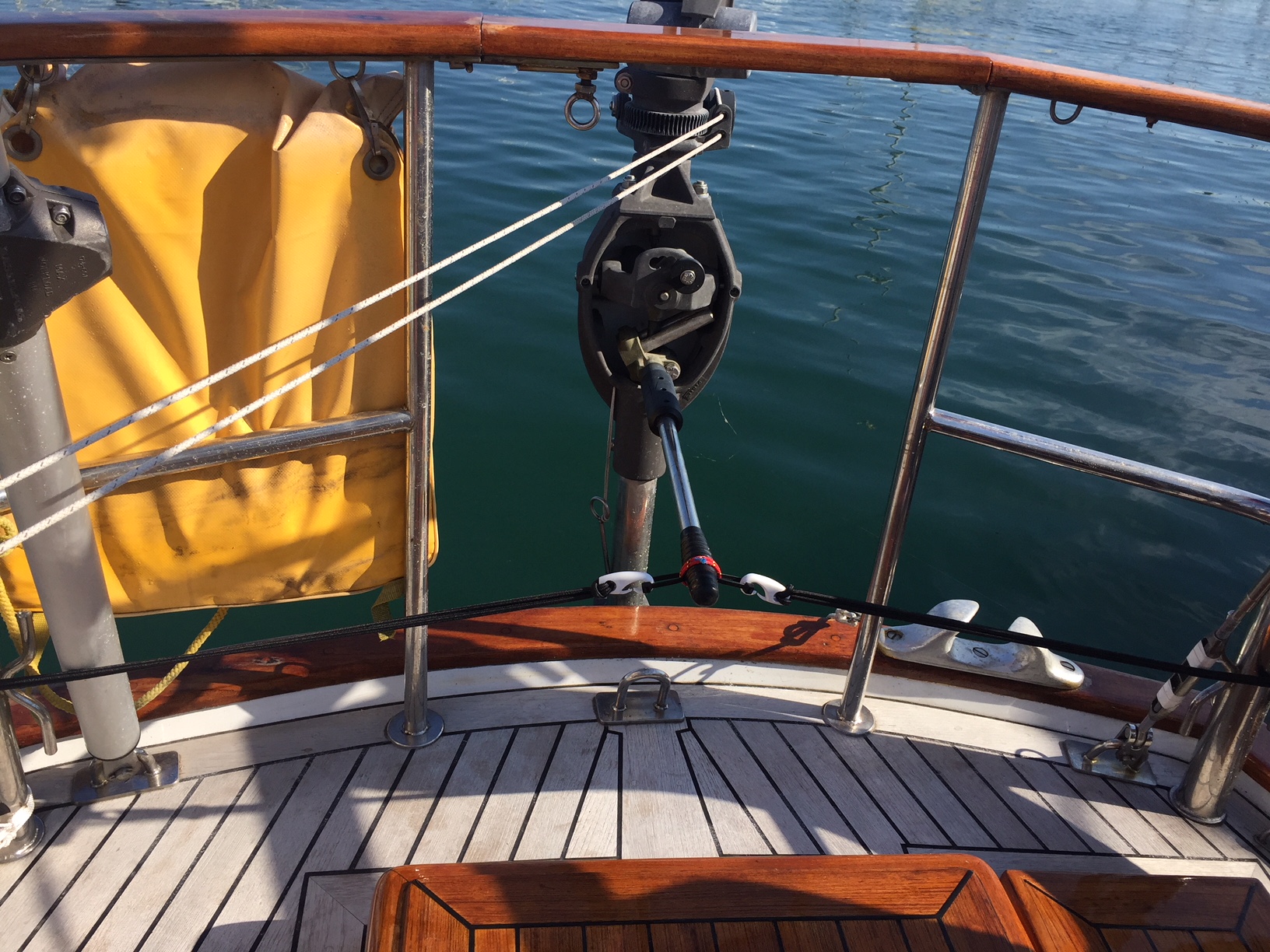We recently saw a great idea in action (thanks Steve & Sally, Tradewind 35)! Two bungee cords attached to an extension on the Hydrovane tiller to keep the Hydrovane Rudder fore and aft. When needed, easy to reach behind and turn the tiller one way or another for added maneuverability (or to help overcome prop wash). As soon as you let go, the bungees pull the tiller back to center. Steve’s maneuverability of this full keel boat in the marina was impressive!