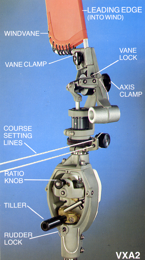 When tacking or gybing, the technique is to loosen the Vane Knob so the vane can be pivoted to nearly the horizontal position and the knob tightened to hold it there. With the vane lowered and trailing aft, the mizzen boom should easily clear the Vane when tacking or gybing.